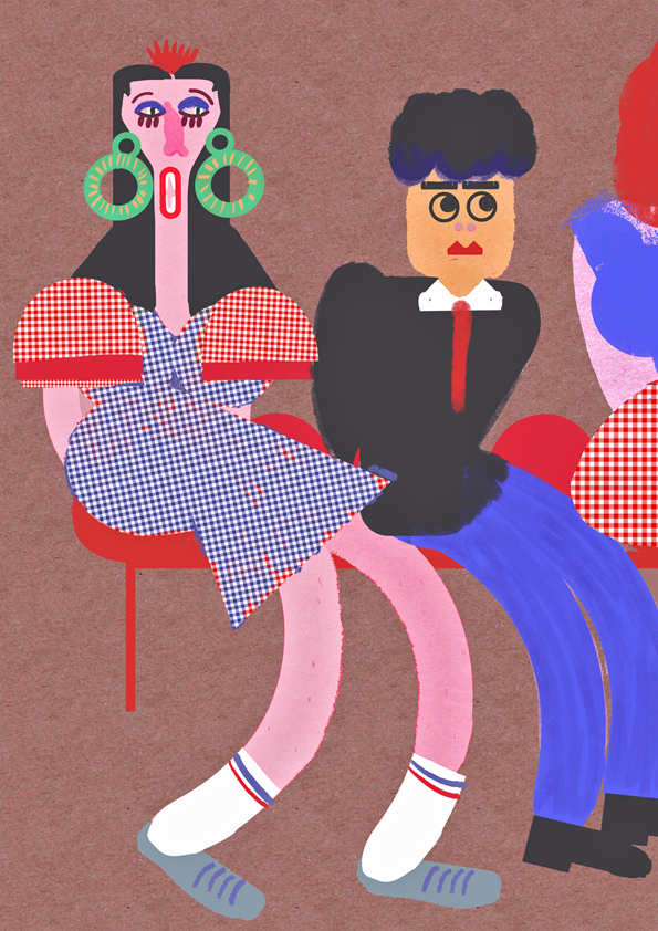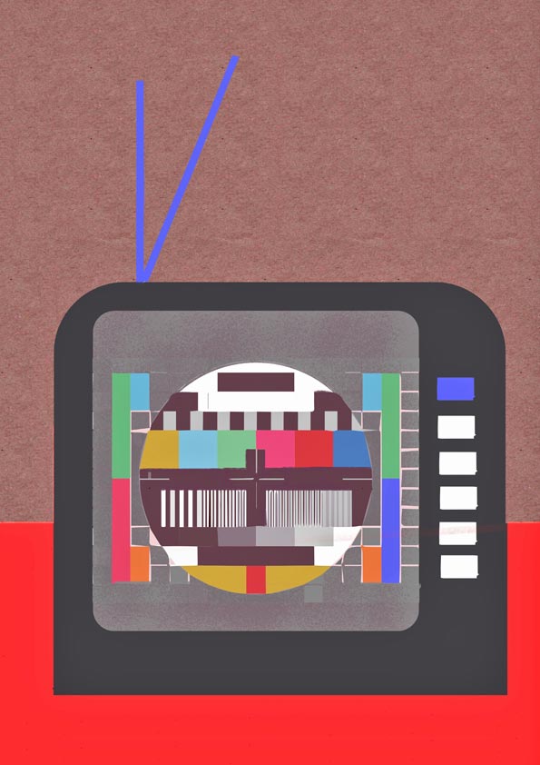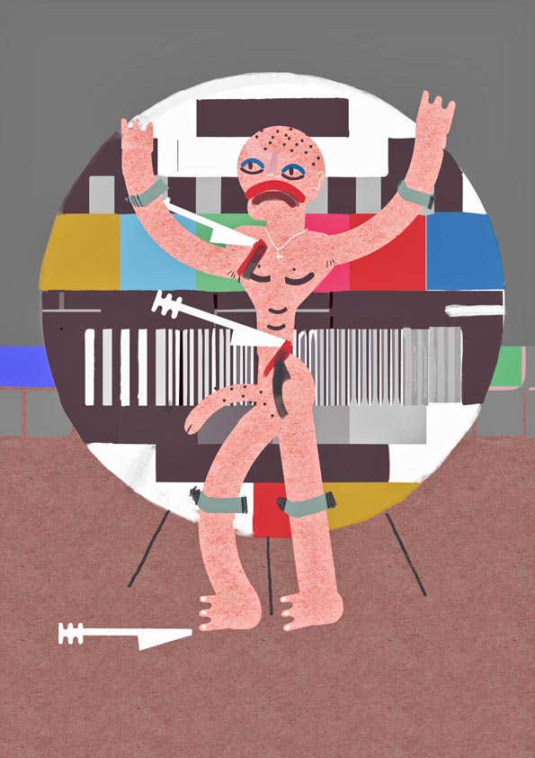Kika “You and I are not like everyone else”, was the title of an solidarity expo honoring Almodóvar cinema. This proposal is an interpretation of the film Kika (1993). A TV test card stars in this cartel. Andrea Caracortada throws knives at a rapist, at his feet, we see what objectively is the penis of a voyeur named Ramón. Printed in methacrylate (130 x 100 cm).