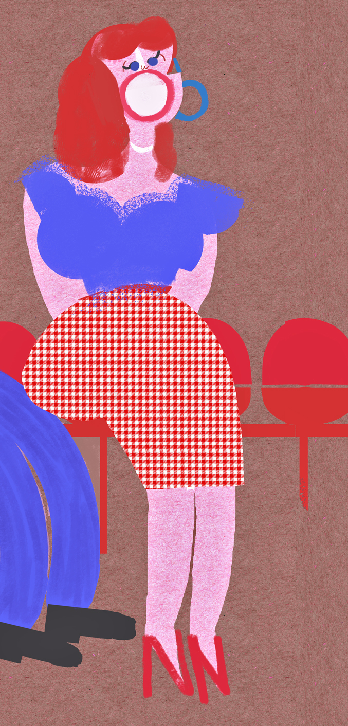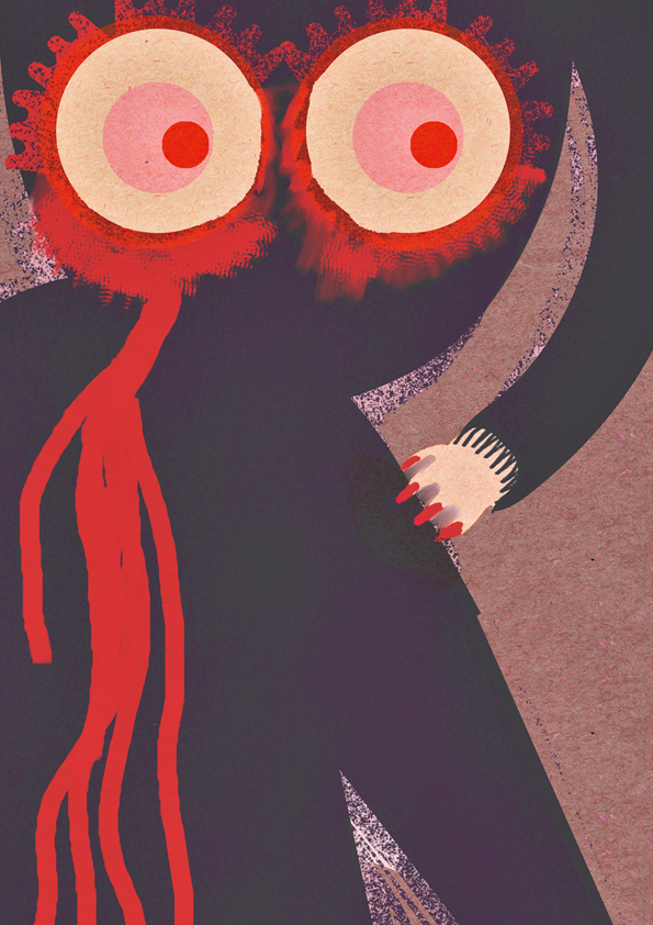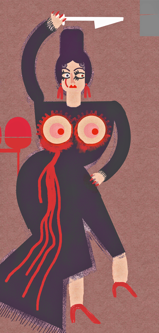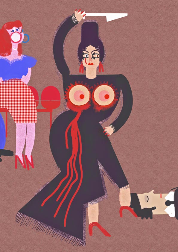 “Tú y yo no somos como todo el mundo”, fue el título de una expo con principios y fines solidarios que homenajeaba al cine de Almodóvar. Esta propuesta es una interpretación de la película Kika (1993). La carta de ajuste de cuentas es una de las protagonistas. Andrea Caracortada lanza cuchillos a un violador, a sus pies, vemos el que objetivamente es el pene de un voyerista llamado Ramón. Impreso en metacrilato (130 x 100 cm).